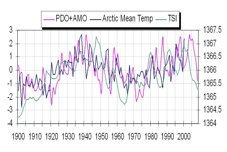 The Arctic temps stop in 2001! It would be good to do a proper plot of Arctic temperature against TSI to blow this canard out of the water once and for all.